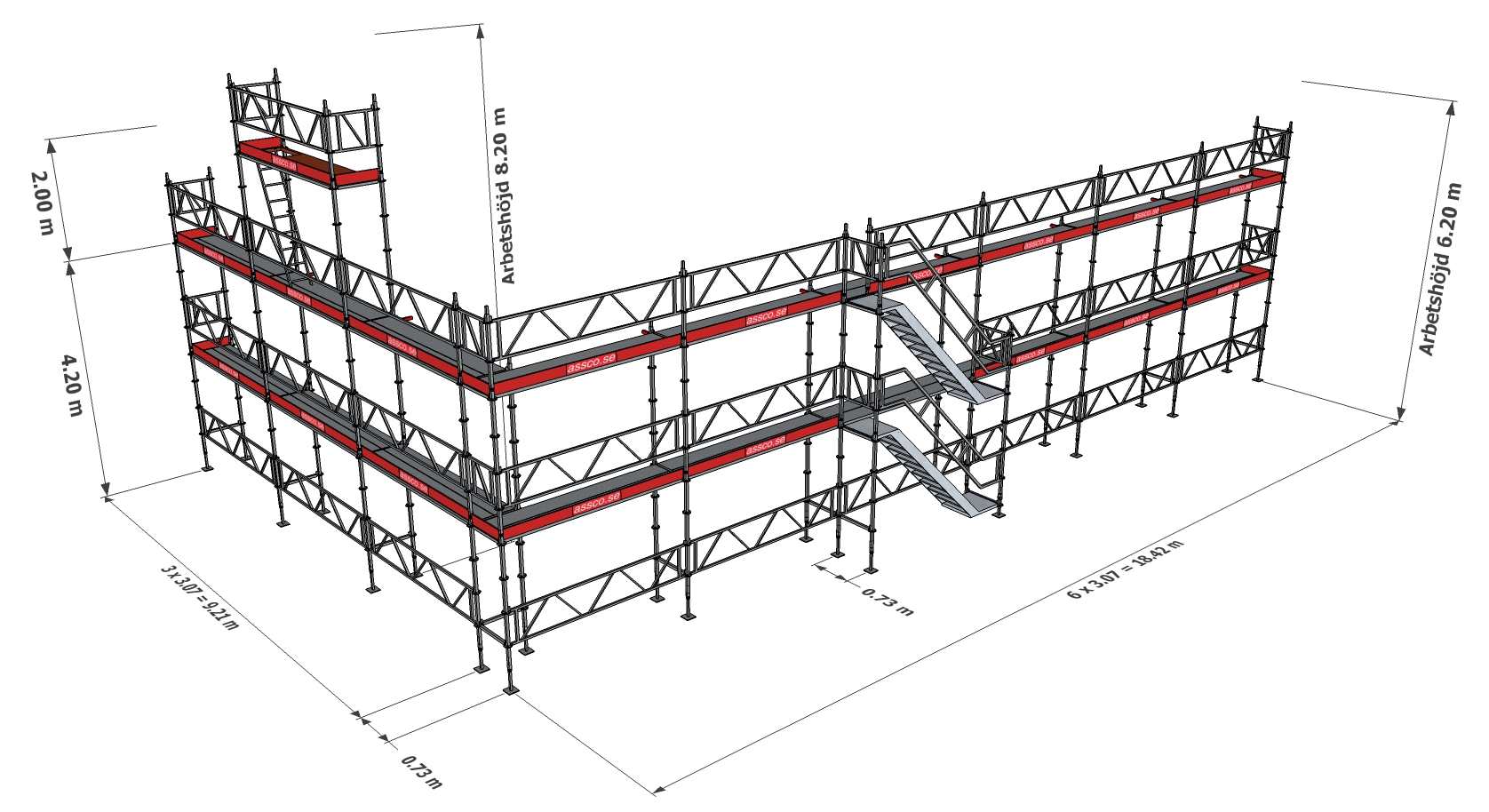 Långsidan bygger på 6 st 3,07m sektioner på längden och 2 st våningar på höjden = 18,42m lång x 6m hög arbetsyta.